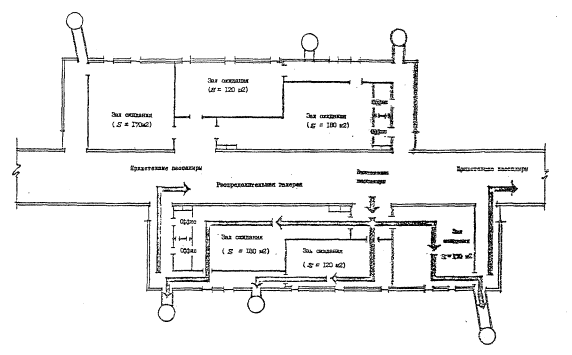Рис.5. Планировочное решение зала-накопителя (модуля) в аэровокзале Франкфурт/Майн (галерея А, зал № 12)