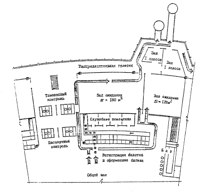 Как видно из таблицы, в аэровокзалах отечественных аэропортов не обеспечивается требуемый уровень обеспеченности площадями, в залах-накопителях, за исключением аэровокзала аэропорта Таллин. Многократное наблюдение за процессом обслуживания пассажиров в аэровокзале Таллин показали, что даже при норме 1,18 м2/чел при размещении в зале-накопителе 76 пассажиров возникает ощущение скученности и соответственно недостаточной комфортности. Следует также учитывать, что уровень занятости пассажирских кресел на линиях Аэрофлота значительно выше, чем на зарубежных авиалиниях. Поэтому наиболее приемлемой для отечественных аэровокзалов представляется норма не ниже 1,5 м2/чел.