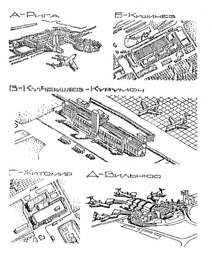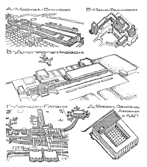 Рис.2. Расширение аэровокзалов методом пристройки очередных объемов Полная или частичная обстройка аэровокзалов наиболее значительно преображает облик первоначальных аэровокзалов (аэропорты Внуково, Ивано-Франковск, Днепропетровск, Лондон-Гатвик, Ереван-Звартноц - первоначальный аэровокзал с КДП, рис.3, А, Б, В, Г, Д). Своеобразие этих решений состоит в том, что прежние фасады частично становятся элементами новых интерьеров, частично декорируются новыми формами или целиком перекрываются большепролетными конструкциями. Такие наиболее кардинальные приемы поглощения новой оболочкой прежнего здания требуют большой культуры строительства и достаточно трудоемки. За разнообразием приёмов планировки и архитектуры расширяемых аэровокзалов прослеживается довольно четкая закономерность: - в тех случаях, когда первоначальное здание морально устарело или составляет малую часть от общего комплекса, как правило, применяются приемы частичного или полного поглощения старого здания новым (аэропорты Ростов-на-Дону, Петропавловск-Камчатский, Киев-Жуляны, Ивано-Франковск, Ереван-Звартноц, Куйбышев-Курумоч, Вильнюс); - в тех случаях, когда расширяется здание, построенное недавно, и объем пристройки сопоставим с объемом первоначального аэровокзала в архитектуре нового повторяются его членения и формы (аэропорты Магадан, Сургут); - в тех случаях, когда к современным аэровокзалам пристраиваются небольшие одноэтажные здания, архитектура существующего здания преобладает в облике нового комплекса (аэропорт Кишинев). Все чаще начинают применяться или планируются приемы использования внутренних резервов планировки, состоящие в застройке навесов, галерей, внутренних дворов аэровокзалов (аэропорты Домодедово, Кишинев, Краснодар). Эти приемы позволяют быстро без трудоемкого капитального строительства увеличивать до 10 - 30 % площади помещений, не меняя существенно архитектуру зданий.