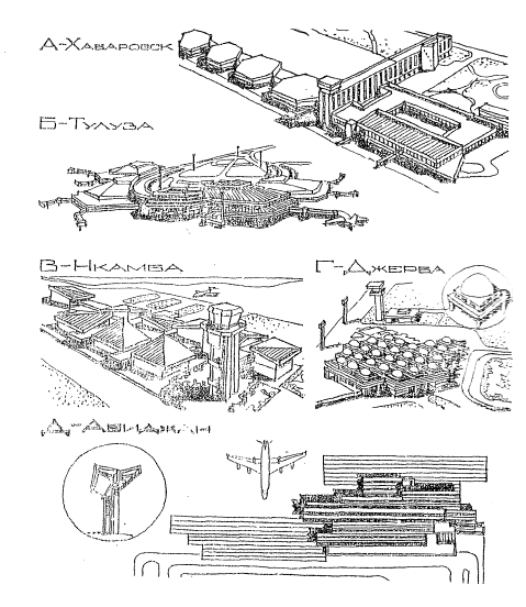 Рис.3. Расширение аэровокзалов методом пристройки и надстройки очередных объемов При высоких темпах роста комплекса расширение эффективно тогда, когда пристройка осуществляется достаточно часто и сравнительно быстро, чтобы свести к минимуму первоначальные недогрузки и последующие перегрузки помещений. Ранее отмечалось, что в настоящее время серьезно отстает строительное обеспечение поэтапно возводимых зданий, которое станет реальностью, когда мы научимся пристраивать быстро, не нарушая устойчивости и не мешая эксплуатации существующих аэровокзалов [1]. Поэтому поиски оптимальных решений современных аэровокзалов направлены, в частности, на ликвидацию осложнений, связанных о пристройкой очередных объемов. Основу новых проектов и построек составляет метод формирования первоначального здания из ряда повторяемых объемов, добавлением которых предусмотрено расширять аэровокзал. Применяются повторяемые объемы двух типов: - крупные, функционально зависимые объемы, в которых обслуживаются пассажиры определенного направления (аэропорты Грозный, Ленинакан, Ганновер, Сан-Луис, Хабаровск, Тулуза, рис.4, А, Б); - мелкие, независимые от функции объемно-конструктивные элементы (аэропорты Даллас-Форт-Уорт, Лион-Саталос, Дюбаи, Нкамба, Джерба, Абиджан, рис.4, В, Г, Д). Крупные единицы "роста" здания имеют автономную планировку, компонуются так, чтобы строительство очередной не мешало эксплуатации предыдущей. Однако их применение не позволяет обеспечить требуемого преобразования планировки по мере изменения техники и технологии. Чередование крупных объемов со специальными вставками, где предусмотрены вестибюли, технические и другие помещения общего пользования, позволяет членить разрастающийся по длине фасад и интерьер на оптимальные по пропорциям элементы и пространства. Так решены аэровокзалы в аэропортах Грозный, Хабаровск, Ганновер. Иначе решен ритм членения объемов в аэровокзалах аэропортов Ленинакан, Сан-Луис, Тулуза. Большепролетные своеобразной конфигурации покрытия отдельных залов примыкают друг к другу непосредственно или зеркально. Мелкие единицы "роста" комбинируются по разному, в зависимости от потребностей расширения; большими, мелкими партиями, в длину, глубину здания, на основе симметрии или асимметрии плана.