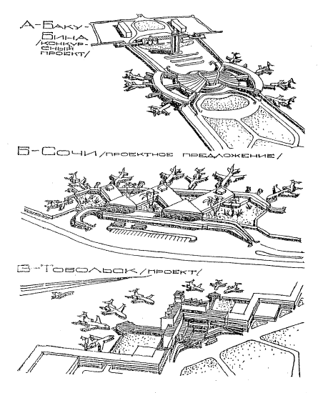Рис.4. Расширение аэровокзалов методом пристройки однотипных крупных объемов и мелких объемно-конструктивных единиц "роста" Возведение мелких стандартных объемно-конструктивных элементов, имеющих продуманную систему стыковки, менее трудоемко, что создает предпосылки к ускорению расширения здания. Однако их применение требует создания новых легких конструктивных систем, высокой сборности и заводской готовности. Добавление крупных и мелких единиц "роста" обеспечивает композиционное единство поэтапно возводимого аэровокзала. Параллельно с разработкой и экспериментальной апробацией новых, быстро возводимых конструкций следует искать более простые приемы расширения зданий на основе применения традиционных конструкций. Одно из возможных направлений - использование приемов застройки полузамкнутых или замкнутых пространств первоначального аэровокзала, а также навесов по его периметру, что заметно сокращает объем строительных работ, позволяет выполнять их в специально отгороженных самой планировкой зонах с применением автомобильных подъемных механизмов. Застройка таких локальных пространств позволяет постепенно переходить от неполной к полной форме плана, существенно не меняя облик здания (проект Украэропроекта для нового аэровокзала аэропорта Краснодар, конкурсный проект Ленгорпроекта для аэропорта Домодедово, конкурсный проект автора для аэровокзала аэропорта Баку-Бина, рис.5, А). В новых проектах аэровокзалов следует предусматривать также возможность увеличения площади трудно расширяемых помещений за счет вытеснения помещений аналогичной технологии и планировки блокируемых аэровокзалов. Такой прием заложен в блокированном аэровокзале аэропорта Грозный; при переносе в другие здания рабочей столовой, гостиницы, профилактория будут увеличены площади кафе для пассажиров, администрации аэровокзала и КДП путем минимальной перепланировки помещений. В аэровокзале аэропорта Пулково планируется расширить помещение внутрисоюзного сектора за счет помещений международного сектора, переносимого в другое здание.