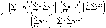 Из табл.1 видно, что сумма объемов производства АРЗ изменяется во времени по закону, близкому к линейному, причем характер изменения примерно одинаковый. Таким образом, можно принять, что закон изменения объема производства по годам будет выражен линейной зависимостью следующего вида: У = А + В.х, (1) Параметры уравнения регрессии А и В определяются по формулам [1]:
