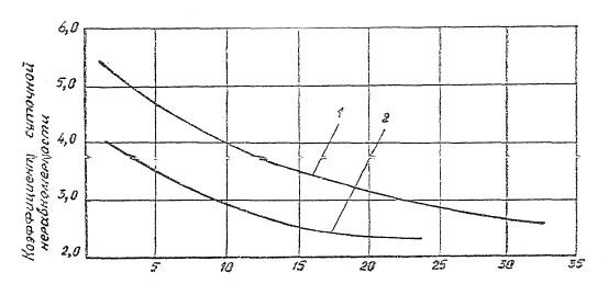 Суточная интенсивность движения самолетов, выл. и пос. Рис.4. Зависимость коэффициента часовой неравномерности от суточной интенсивности движения самолетов: 1 - холодная климатическая зона (f2(x) = 0,35x2 - 0,62x + 5,946) 2 - теплая и умеренная климатические зоны (f2(x) = 0,151x2 - 1,286х+ 6,63) Таблица 9