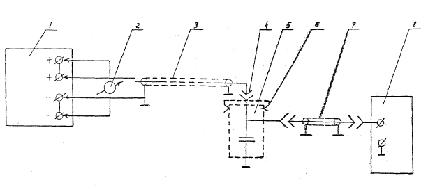Pис.2. Схема проверки электрометра ЭТ-1: 1 - блок питания; 2 - образцовый вольтметр, 3 - кабель для калибровки; 4 - разъем; 5 - кружка-датчика, 7 - измерительный кабель; 8 - блок измерения