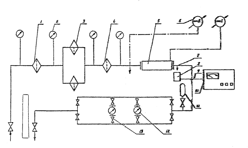 Рис.3. Принципиальная схема сравнительных испытаний устройства ЭП-1; 1 - фильтр ТФ-10 с чехлом ТФЧ-16к; 2 - манометр; 3 - фильтр-сепаратор CT-500-2; 4 - фильтр ТФ-10 с ТФБ; 5 - нейтрализатор; 6 - микроамперметр М-95; 7 - место отбора пробы; 8 - датчик-кружка; 9 - измерительный кабель: 10 - электрометр топливный; 11 - гидроамортизатор; 12 - счетчик-литромер ЛЖ-100-8; 13 - задвижка Принципиальная схема приемочных испытаний электрометра приведена на рис.3. Топливо из резервуара с помощью насоса подается на блок фильтрации 1, 3, 4, нейтрализатор статического электричества, счетчики-литромеры 12 и обратно в резервуар. Замер плотности заряда топлива производится электрометром 10, а ток электризации измеряется с помощью микроамперметров 6. Определение плотности заряда топлива по току электризации производится по формуле: