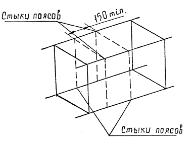 3.4. Разметка3.4.1. Разметку заготовок элементов металлоконструкций производить с соблюдением следующих требований: длина пристыкованного элемента должна быть не менее 15σ (σ - толщина листа, полки уголка), но не менее 150 мм; стыки поясов должны быть смещены по отношению к стыкам стенок не менее, чем на 150 мм; стыки поясов и стенок должны стоять от диафрагмы е менее, чем на 50 мм (рис.6); в решетчатых конструкциях стыки поясов должны располагаться на расстоянии не менее 150 мм от кромок узловых косынок и взаимное расположение их в смежных сечениях должно соответствовать рис.7.