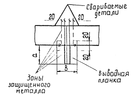 3.5.16. При сборке под сварку в начале и конце стыковых швов должны, как правило, устанавливаться выводные планки. Необходимость установки выводных планок и их размеры, которые должны быть не менее а = 60 мм, в - 80 мм (рис.12), определяется технологическим процессом изготовления. Выводные планки должны иметь такую же разделку, как свариваемые детали. Выводные планки должны быть установлены в одной плоскости со свариваемыми деталями и плотно прилегать к их зачищенным кромкам. Допуски на точность установки выводных планок такие же, как и при сборке деталей под сварку.
