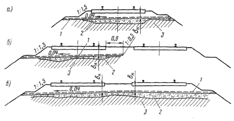 Рис. 1. Схемы укладки покрытия из нетканого материала при устранении просадок пути и расстройств рельсовой колеи по уровню и в профиле на неустойчивых участках земляного полотна в пределах насыпей: a - на однопутной линии; б, в - на двухпутной линии под один путь и под два пути; 1 - нетканый материал; 2 - балласт; 3 - глинистые грунты Дно