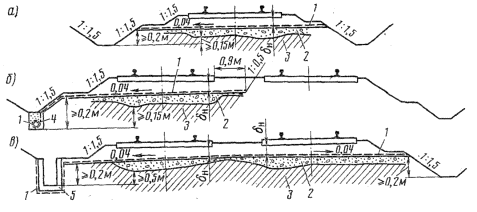 размешают по всей высоте насыпи в пределах неустойчивого участка и по Конструкция покрытия в поперечном разрезе приведена на рис. 7,a. Глубина расположения нетканого материала под