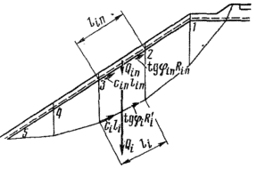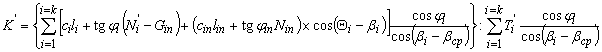 В формуле (1) введены следующие обозначения: ci, φi - соответственно удельное сцепление и угол внутреннего трения грунта на линии возможного смещения; Ni' , Тi' - соответственно нормальная и тангенциальная к линии возможного смещения составляющие суммарной силы тяжести i -го блока: