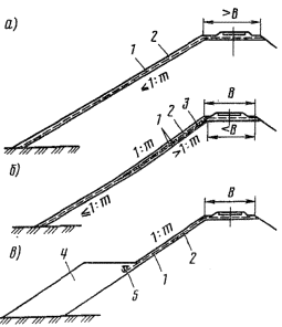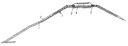 не менее Укладку покрытия производят на обоих откосах. Если второй откос находится в стабильном состоянии и нет угрозы его смещения, укладка покрытия допускается на одном откосе. В последнем случае уклон покрытия в пределах основной площадки должен быть односторонним (в сторону защищаемого откоса). Отвод воды от покрытия осуществляется продольными канавами,