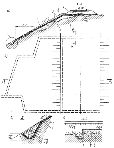 железобетонные плиты размерами 3x2,5 м с гибкими связями на слое щебня сборные железобетонные плиты размерами 3x2,5 м с дренажными отверстиями, омоноличенные по контуру шпонкой ЦНИИСа, на нетканом материале (рис. 13, в). 9.3. Если откосы сложены глинистыми песками, супесями,