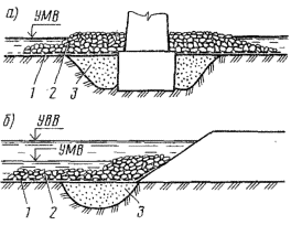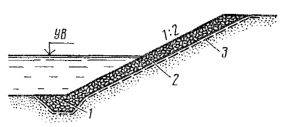 Рис. 12. Схема укрепления подтопляемого откоса каменной наброской с обратным фильтром из нетканого материала: 1 - упорная каменная призма; 2 - каменная наброска; 3 - нетканый материал