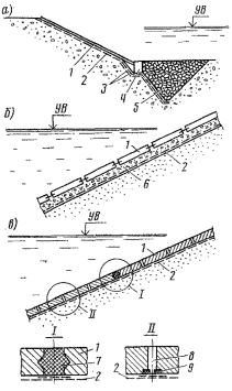Рис. 13. Схема укрепления подтопляемых откосов бетонными или железобетонными плитами с обратным фильтром из нетканого материала: а - общий вид; б - неомоноличенные плиты с гибкими связями на щебеночной подготовке; в - железобетонные плиты, омоноличенные по контуру шпонкой ЦНИИСа; 1 - плиты; 2 - нетканый материал; 3 - то же в два слоя; 4 - упор: 5 - защитная каменная призма; 6 - щебень; 7 - бетон омоноличивания; 8 - дренажное отверстие; 9 - деревянный вкладыш размером 50×100 мм 9.4. При укреплении откоса неомоноличенными сборными плитами (см. рис. 13, б) слой щебня между плитами и нетканым материалом может не предусматриваться, если швы между плитами будут заполнены щебнем, частицы которого соединяются между собой связующим, В качестве связующего используют, например, латекс, битум. 9.5. Проектирование и расчет внешнего укрепления из каменной наброски и неомоноличенных сборных плит со щебеночной подготовкой на нетканом материале выполняют в соответствии с действующими типовыми проектами, как для обычной конструкции с обратным фильтром из природных материалов. Толщину сборных железобетонных плит (в см), омоноличенных по контуру шпонкой ЦНИИСа, рассчитывают на волновое воздействие