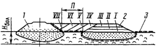 Рис. 15. Схема покрытия из нетканого материала с каменной наброской при размыве дна: а - у опоры; б - у траверса; 1 - нетканый материал; 2 - каменная наброска; 3 - воронка размыва, заполненная грунтом 9.9. Гибкие конструкции с применением нетканого материала могут укладываться на предварительно намытый или отсыпанный "пляж", зимой со льда либо со специальных подмостей, расположенных на плавсредствах. Для того чтобы покрытие не унесло потоком, до его погружения под воду необходимо обеспечить надежное заанкеривание на береговой полосе, откосе или дне с обеспечением его постоянной пригрузки. 10. УСИЛЕНИЕ НАСЫПЕЙ НА СЛАБОМ ОСНОВАНИИ ПРИ ЭКСПЛУАТАЦИИ ЖЕЛЕЗНОДОРОЖНЫХ ЛИНИЙ10.1. При усилении эксплуатируемых насыпей на болотах наряду с периодической подъемкой пути выполняют отсыпку берм. При этом выторфовывание, как правило, производить нельзя, что осложняет производство работ, увеличивает срок стабилизации берм с опасностью вовлечения в подвижку существующей насыпи. С целью повышения безопасности движения поездов и технологичности работ в основание берм укладывают нетканый материал, размещая его на всю ширину бермы понизу и на откосе существующей насыпи. Отсыпку берм с использованием нетканого материала в качестве армирующей прослойки в основании следует начинать с полевой стороны, постепенно приближаясь к существующей насыпи. Полевую часть бермы сооружают первоначально в виде отдельной насыпи. Ее высоту, считая от поверхности болота, принимают выше проектной высоты существующей насыпи из расчета создания максимальной нагрузки и ускоренного погружения на минеральное дно, но не менее 2/3 глубины болота. Это способствует быстрому отжатию воды и уплотнению торфа. Для отсыпки берм используют пески всех разновидностей, вплоть до пылеватых. Грунт выгружают из думпкаров на подходах к участку сооружения берм на прочном основании. Выгруженный грунт бульдозерами или комплексом экскаваторы - автомобили-самосвалы - бульдозеры укладывают в бермы методом "с головы". Расстояние между подошвами откоса существующей насыпи и присыпаемой бермы П назначают в зависимости от глубины болота Нбол в соответствии со схемой рис. 16: