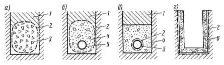10.1. Отсыпку грунта до создания слоя 10.5. При использовании нетканого материала в основании насыпи на мари бермы не устраивают. Работы выполняют без повреждения мохоторфяного покрова, в том числе в теплое время года, не дожидаясь промерзания деятельного слоя. 11. ПРИМЕНЕНИЕ НЕТКАНОГО МАТЕРИАЛА В ДРЕНАЖАХ11.1. Нетканый материал в роли обратного фильтра в дренажах используют в соответствии со схемами рис. 17. Дренажи устраивают в сочетании с противодеформационными конструкциями различного назначения: противопучинные подушки, тепло- и гидроизоляционные слои, покрытия из нетканого материала или комбинированные покрытия на основной площадке, откосах насыпей и т. п. Кроме этого, закрытые дренажи с обратным фильтром из нетканого материала сооружают для улучшения условий водоотвода в выемках, в том числе обводненных, под "погребенными" кюветами, на стрелочных горловинах для отвода воды от приводов стрелок, при устройстве поперечного выпуска воды на станциях, двухпутных и многопутных линиях. 11.2. "Глухие" дрены (рис. 17, а) выполняют, оборачивая нетканым