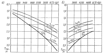 где Z'- глубина промерзания-оттаивания земляного полотна при устройстве подушки из песчано-гравийной смеси или асбестовых отходов в верхней части зоны промерзания-оттаивания; hдоп - допустимая толщина промерзающего или оттаивающего слоя пучинистых грунтов под подушкой. Значение Z' в формуле (5) определяют для данного климатического района в зависимости от вида применяемых грунтов подушки по кривым hп и ha на номограммах (см. рис. 1, 3, 5, а, 5, б), интерполируя при необходимости между ними. При интерполяции необходимо учитывать, что толщина слоя hп или ha на кривой hпmax или hamax равна для данных климатических условий глубине промерзания-оттаивания Zmax. В качестве hп и ha принимают суммарную толщину подушки и балластного слоя, т.е. П'+hб. При устройстве подушки из шлака ее толщину определяют по формуле (5), - в которой Z'=Zmax и находится по кривой hшmax на номограммах рис. 4 и 5, в. Искомую толщину подушки из песчано-гравийной смеси или асбестовых отходов по формуле (5) находят методом последовательного приближения после определения hдоп. При известной hдоп добиваются соблюдения равенства