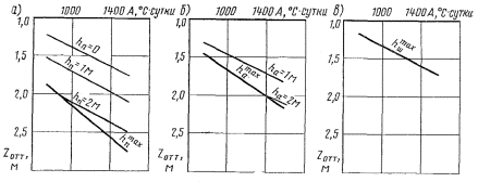 При наличии балластных корыт и лож вырезку и замену пучинистого грунта производят в соответствии с изложенными требованиями, но на глубину не менее 0,1 м ниже дна этих углублений. 4.2. Расчет противодеформационных конструкций по допустимой величине пучения4.2.1. Необходимую толщину врезных, комбинированных и накладных подушек, а также высоту подъемки пути на балласт по допустимой величине пучения определяют с помощью номограмм. При расчете врезных и комбинированных подушек из песчано-гравийной смеси или песка используют номограммы на рис. 2 и 5, а, из асбестовых отходов - номограммы на рис. 3 и 5, б, из доменного гранулированного или котельного шлака - номограммы на рис. 4 и 5, в. Расчет накладных подушек и высоты подъемки пути на балласт производят с помощью номограмм на рис. 2 и 5, а. Порядок использования номограмм в конкретных климатических и мерзлотных условиях изложен в п. 4.1.3. Условные обозначения расчетных параметров на номограммах следующие: Ω - многолетняя средняя сумма градусо-суток отрицательных температур наружного воздуха; А - многолетняя средняя сумма градусо-суток положительных температур наружного воздуха; Zпр - глубина сезонного промерзания земляного полотна от верха балластной призмы; Zотт - глубина сезонного оттаивания земляного полотна от верха балластной призмы; hп - суммарная толщина подушки из песчано-гравийной смеси и балластной призмы; ha-суммарная толщина подушки из асбестовых отходов и балластной призмы; hш - суммарная толщина подушки из шлака и балластной призмы; hпmax ,hamax и hшmax- соответственно величины, hп ,ha и hш при полном выведении зоны промерзания-оттаивания из пучинистых грунтов. Расчетные схемы врезных и комбинированных подушек при полном и частичном выведении зоны промерзания из пучинистых грунтов, подъемки пути на балласт и накладных подушек приведены на рис. 6. 4.2.2. При полном выведении зоны промерзания-оттаивания из пучинистых грунтов толщина врезной или комбинированной подушки из песчано-гравийной смеси, асбестовых отходов или шлака