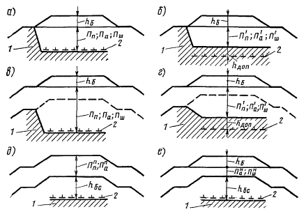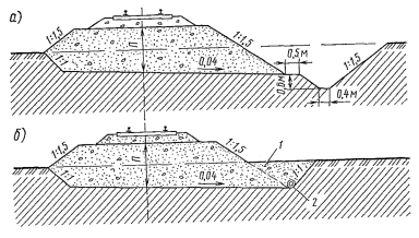 Примечание. Значения в скобках даны для скорости движения поездов более 100 км/ч. Температуру воздуха в защитном кожухе (температуру его поверхности) определяют в конце периода промерзания вытяжными термометрами, размещаемыми внутри кожуха или в скважине, закладываемой в сечении по оси трубопровода до верха кожуха. 4.3.4. При устройстве комбинированных подушек (рис. 15, 16) вырезку и замену грунта во врезной части производят на глубину не менее 0,1 м ниже уровня основной площадки (границы раздела дренирующих материалов балластного слоя и пучинистых грунтов), а при наличии балластных углублений - на глубину не менее 0,1 м ниже дна этих углублений. Уширение насыпи для размещения накладной части подушки выполняют до уровня дна врезной части подушки (рис. 17). При ширине отсыпаемой части менее 3 м, а также при наличии балластных шлейфов на откосах уширение производят дренирующим грунтом с коэффициентом фильтрации более 3 м/сут (рис. 17, а, б). При ширине отсыпаемой части более 3 м на насыпях высотой свыше 2 м допускается применять местный грунт (рис. 17, в). На высоких насыпях (2<Н<6 м) балластные шлейфы срезают и в связных грунтах очищенного откоса насыпи устраивают уступы высотой 0,5-1 м. 4.3.5. Конструкция подъемки пути на балласт в поперечном, сечении земляного полотна показана на рис. 18. Уширение насыпей при подъемке пути производят до уровня существующих обочин в соответствии с требованиями п. 4.3.4. Подъемку пути в выемках выполняют без уширения основной площадки земляного полотна. Для отвода воды по дну старых кюветов укладывают дренажи мелкого заложения (дренажные трубофильтры) или устраивают лотки. В целях уменьшения высоты лотков их можно сооружать за пределами кювета в нижней части откоса выемки. На двух- и многопутных линиях подъемку выполняют по всем путям; превышение одного пути над другим допускается в пределах, установленных нормами.
