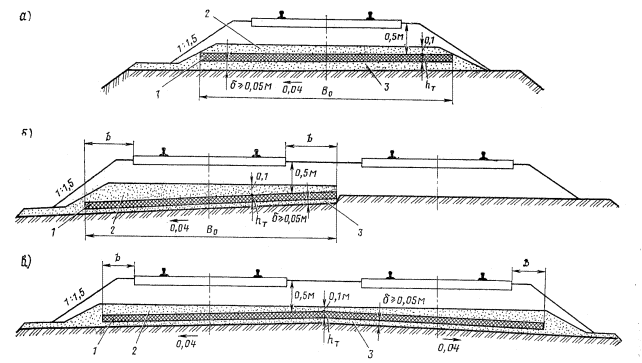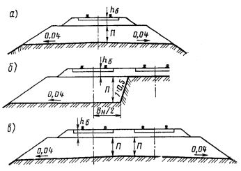 Рис. 9. Схема устройства врезных подушек на насыпи однопутного участка (а), под один (б) и. под два пути (в), на двухпутном участке.