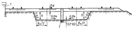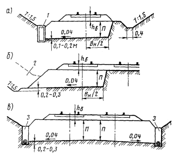 Рис. 10. Схема устройства врезных подушек в выемке однопутного участка (а), под один (б) и под два пути (в) на двухпутном участке: 1 - лоток; 2 - углубленный кювет; 3 - дренаж Сопряжения накладной части комбинированной подушки проектируют по требованиям, указанным для накладных подушек. 4.3.3. Врезные подушки проектируют с односторонним или двухсторонним отводом воды в поперечном направлении со сплошными выпусками (по длине подушки) на откосы насыпей, в углубленные кюветы, лотки, дренажи, которыми осуществляется продольный отвод воды в выемках. Поперечный уклон по дну подушек должен быть не менее 0,04 (рис. 9, 10). Конструкцию водоотводов, проектируют в зависимости от местных условий. Врезные подушки из асбестовых отходов при залегании грунтовых вод ниже границы промерзания более 1 м допускается устраивать без выпуска воды. Ширину противопучинных подушек определяют в зависимости от количества путей на оздоравливаемом участке земляного полотна, конструкции подушки и условий отвода воды. При устройстве одностороннего отвода воды из врезных подушек расстояние от оси пути до невырезанного грунта по дну подушки Вн/2 должно быть не менее 1,8 м. Крутизну грунтовых откосов врезной части подушек принимают не более 1:0,5. Для отвода воды в выемках глубиной до 2 м целесообразно нарезать углубленные кюветы. В более глубоких выемках сооружают лотки или дренажи.