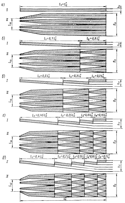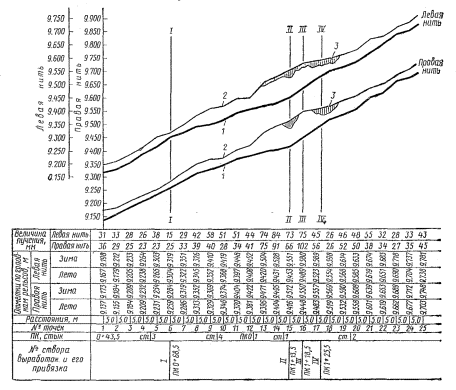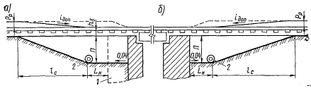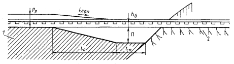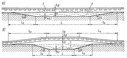 где iдоп - допустимый уклон отводов рельсовых нитей дополнительно к существующему на элементе профиля в зависимости от скорости движения v поездов (при v≤100 км/ч iдоп=0,001; при v>100 км/ч iдоп=0,0005). При устройстве врезных или комбинированных подушек на земляном полотне, сложенном пучинистыми грунтами как в пределах усиливаемого деформирующегося участка, так и вне его, длина сопряжения определяется величиной морозного пучения, наблюдаемого по концам подушки. Сопряжения выполняются постепенным линейным уменьшением глубины вырезки на участке, соответствующем длине отводов рельсовых нитей с допустимым уклоном iдоп (рис. 8).