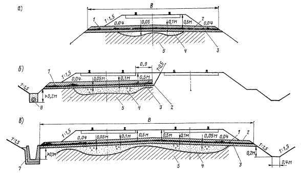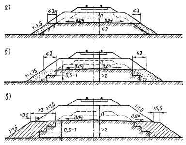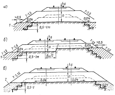 Рис. 17. Схема уширения насыпей при устройстве комбинированных подушек с применением дренирующего (а, б) и местного (в) грунтов