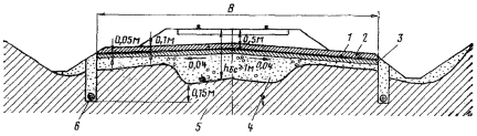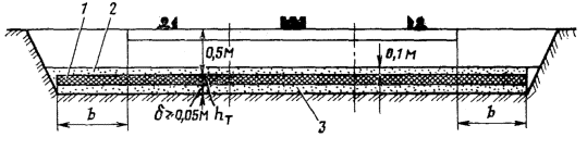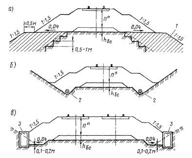 однопутном участке (а), под одним (б) и под двумя путями (в) на двухпутном участке: 7.6. Планировку грунта под гидроизоляционное покрытие в поперечном направлении производят в одну или в обе стороны с уклоном не менее 0,04 по всей ширине земляного полотна по верху. На двухпутном участке при устройстве покрытия на одном пути грунт планируют на половину этой ширины. Выпуск воды от спланированной поверхности устраивают по всей длине участка покрытия в водоотводные сооружения выемок или на откосы насыпей. При существующей общей толщине слоя балластных и дренирующих материалов hбc>1 м выпуск воды осуществляют в продольные лотки или дренажи мелкого заложения, устраиваемые по краям гидроизоляционного покрытия (рис. 27). Дно этих водоотводов должно быть ниже дна балластных углублений на основной площадке на 0,15 м. При укладке покрытия на станционных путях и в пределах стрелочных переводов воду выпускают в продольные лотки или дренажи мелкого заложения, устраиваемые в междупутье. На участках с близким расположением грунтовых вод (менее 1 м от границы промерзания) для понижения уровня этих вод в комплексе с гидроизоляционным покрытием устраивают продольные дренажи. Укладка покрытия без устройства дренажей в этих условиях не допускается. Гидроизоляционную пленку в покрытии укладывают в один или два слоя. При укладке одного слоя пленки по всей ширине ее устраивают нижний защитный слой. Толщина его при использовании песка или асбестовых отходов должна быть не менее 0,05 м. При укладке пленки в два слоя нижний защитный слой можно не устраивать. Пленку при этом укладывают непосредственно на спланированные грунты (щебень, песчано-гравийный или асбестовый балласт или связные грунты земляного полотна). Толщина верхнего защитного слоя из песка или асбестовых отходов должна быть не менее 0,1 м. 7.9. Полосы пленки в покрытии укладывают вдоль пути в несколько рядов с перекрытием каждого последующего нижележащего ряда на ширину не менее 10 см. Количество рядов определяется шириной полос. При укладке гидроизоляционной пленки в два слоя полосы в верхнем слое стыкуются между собой так же, как и в нижнем. При этом стыки в верхнем и нижнем слоях в поперечном сечении должны отстоять друг от друга на величину не менее 30 см. При необходимости отдельные полосы пленки в каждом слое могут быть соединены между собой. Ширина перекрытия в этом случае зависит от технологии соединения.