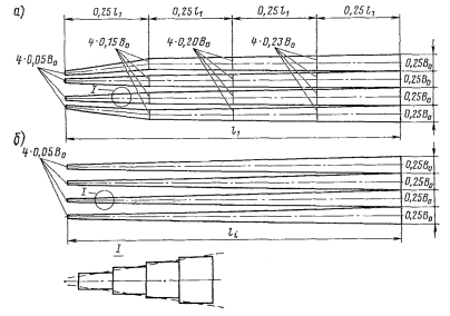 пенопластовых плит в покрытии: 6.8. Сопряжения выполняют для плавного увеличения глубины промерзания грунтов по краям теплоизоляционного покрытия. Это достигается за счет уменьшения толщины тепловой изоляции и создания просветов между плитами пенопласта, которые заполняют песком или асбестовыми отходами. Длина сопряжения lтс определяется величиной равномерного пучения у краев теплоизоляционного покрытия и допустимым уклоном отвода рельсовых нитей по формуле (13), в которой Рдоп принимают равным нулю. Сопряжение разбивается на отдельные элементы. Количество этих элементов равно количеству слоев плит пенопласта в покрытии. Относительная длина элементов сопряжений при различном количестве слоев указана на рис. 24. Элемент, имеющий один слой, состоит из четырех продольных полос пенопласта, уменьшающихся по ширине. При большем количестве слоев под этими полосами располагается сплошное (без просветов) покрытие. Конструкция элементов сопряжения показана на рис. 25. Продольные полосы на элементах сопряжения устраивают из отдельных прямоугольных блоков со ступенчатым изменением ширины. Нижний слой плит пенопласта у края сопряжения выводится на уровень верха покрытия. 6.9. Сопряжения по краям теплоизоляционного слоя, уложенного в пределах стрелочного перевода, сооружают в соответствии с требованиями п. 6.8 в трех направлениях - за рамными рельсами и за крестовиной по прямому и боковому путям.