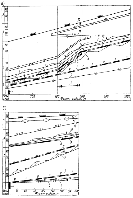 способом: После укладки решетки выгружают песок или асбестовые отходы по всей длине шпалы для верхнего защитного слоя и с помощью электробалластера без струнок поднимают путь. Затем выгружают балластные материалы и производят подъемку пути до проектных отметок. Графики производства работ в «окна» при укладке тепловой изоляции из пенопласта представлены на рис. 29. 9.7.3. При устройстве гидроизоляционного покрытия подготовку основания под укладку полимерной пленки производят в соответствии с требованиями п. 9.7.2.