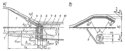 откос водоотводной канавы; 9 - откос земляного валика; 10 - снежный покров