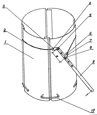 уплотняют слоями толщиной 15- Гравийно-песчаную подушку устраивают переменной толщины вдоль оси трубы с учетом строительного подъема. На талых слабых и слабых в оттаявшем состоянии вечномерзлых грунтах основания, а также на сильно сжимаемых грунтах, подстилаемых более прочными, толщину гравийно-песчаной подушки определяют расчетом с соблюдением требований СНиП 2.05.03-84. Строительный подъем для труб, расположенных на скальных и других несжимаемых грунтах можно не устраивать. На вечномерзлых грунтах основания строительный подъем назначают с учетом осадки основания за счет протаивания грунтов в соответствии с методикой, изложенной в ВСН 176-78. 2.2.3. После устройства гравийно-песчаной подушки приступают к монтажу звеньев тела трубы. Сборку трубы из стеклопластиковых элементов производят в следующей последовательности: предварительно собирают все звенья при вертикальном расположении продольной оси (гофры элементов параллельны поверхности сборочной площадки). В качестве продольного стыка принят стык "в замок" без применения крепежных деталей, конструкция которого выполнена с использованием технического решения по а.с. № 1105714. В качестве поперечного стыка принят стык "внахлестку"; при сборке первого звена очередной элемент стыковой частью, имеющей прорези, последовательно заводят в стыковую часть предыдущего элемента; для окончательного смыкания (защелкивания) замков в продольных стыках на первую впадину гофра, лежащего на площадке звена, накидывается трос с натяжным рычагом (рис. 2); конец троса 2 с помощью серьги 3 и пальцев соединяется с концом рычага 9, другой конец троса с помощью накидной серьги 7 и вставного пальца 8 соединяется с рычагом 9, образуя плечо "а"; поворотом конца рычага 9 в сторону, показанную стрелкой, создается стягивающее усилие. В нижней части звена, для фиксации элементов и исключения самопроизвольной расстыковки при сборке в отверстия, предназначенные для монтажных болтов, вставляют инвентарные скобы 10. Вместо скоб можно устанавливать второй стягивающий трос. После замыкания стыков первое звено трубы устанавливают в горизонтальное положение; последующие звенья также собирают на площадке, но без замыкания одного из продольных стыков и обжатия. После сборки последующее звено накладывают на предыдущее, замыкают четвертый про дольный стык и с помощью натяжного приспособления окончательно защелкивают замки продольных стыков, а далее соединяют элементы поперечного стыка и устанавливают монтажные накладки и болты (по проекту);