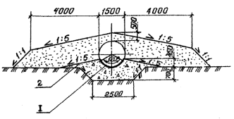 Рис.4. Схема расположения трубы при засыпке: 1 - защитный лоток; 2 - гравийно-песчаная подушка Трамбовку производят до получения характерного "отказа", при которой дальнейшего уплотнения грунта не происходит, а продолжение трамбования грунта вызывает подъем трубы над основанием. После отсыпки каждого очередного слоя защитной призмы подбивку пазух трубы производят до высоты защитной призмы, равной половине диаметра грубы. 2.2.9. Грунт в тело насыпи на первом этапе отсыпают