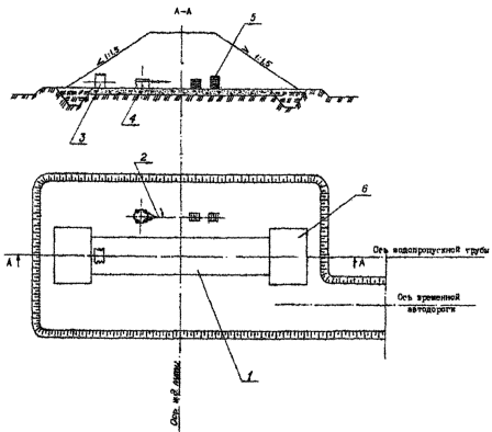 высота засыпки над трубой должна составлять не менее 2.2.13. Опытные стеклопластиковые трубы сооружают в любой время года при условии обеспечения устройства подушки, отсыпки и уплотнения защитной призмы из талой песчано-гравийной смеси. При этом не допускается наличия мерзлых комьев в песчано-гравийной смеси и смерзание смеси до окончания уплотнения. 2.2.14. До накопления необходимого опыта основные работы по строительству сборных стеклопластиковых труб, а именно, устройство подушки, сборка трубы, отсыпка и уплотнение защитной призмы вокруг нее следует выполнять в присутствии представителей из ЦНИИС. 2.2.15. Насыпь за пределами защитной призмы возводит мехколонна (или аналогичная ей организация) в соответствии с требованиями, предъявляемыми к сооружению земляного полотна. 2.2.16. После возведения и стабилизации насыпи над трубой, но не ранее, чем через шесть месяцев после засыпки трубы, для защиты внутренней поверхности трубы от интенсивного, износа устраивают сборный бетонный лоток. 2.3. Указания по организации работ 2.3.1. Все работы по сооружению водопропускной трубы из гофрированного стеклопластика выполняет комплексное звено в составе пяти человек, в том числе: монтажники конструкций: 5 разр. - 1, 4 paзp. - 1, 3 разр. - 1, машинист бульдозера Д-572С 6 разр. - 1; машинист крана КС-3571 6 разр. - 1. Кроме того, для обслуживания механизмов привлекают дежурного слесаря 5 разр., а для обслуживания электрооборудования - дежурного электромонтера 5 разр. 2.3.2. В начале производства работ все монтажники конструкций под руководством мастера разбивают и закрепляют на местности ось трубы, размечают контуры строительной площадки и котлована под гравийно-песчаную и цементно-грунтовые подушки, производят высотную разбивку и нивелирование с привязкой к реперу, расположенному вблизи трубы. В это время машинист бульдозера разравнивает грунт на строительной площадке, а затем приступает к планировке. По окончании планировки монтажники конструкций выгружают лесоматериал, устраивают навесы, размещают оборудование, инвентарь, приспособления, а затем приступают к устройству цементно-грунтовых и гравийно-песчаной подушек. 2.3.3. После тщательного уплотнения гравийно-песчаной подушки монтажникам 5 и 4 разр. приступают к сборке гофрированной трубы из отдельных звеньев, а монтажник 3 разр. вначале разгружает элементы гофрированной трубы, а затем помогает монтажникам 5 и 4 разр. собирать звенья из отдельных элементов. После сборки средних звеньев все монтажники собирают элементы оголовков трубы. Перед засыпкой трубы они тщательно подсыпают и подбивают песчано-гравийной смесью нижние пазухи, обеспечивая боковые откосы подсыпки под углом 40-45 к горизонту. Подбивку осуществляют ручными деревянными трамбовками. Далее все монтажники засыпают трубу горизонтальными слоями