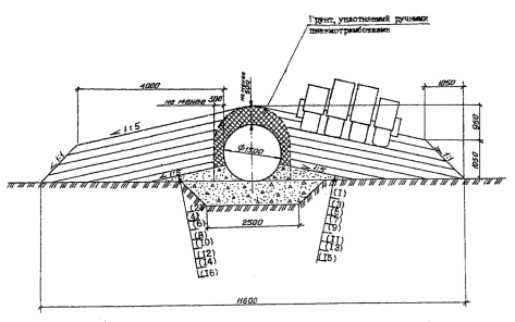 Рис.5. Схема уплотнения грунта засыпки трубы пневмокатком: 1 - 16 - последовательность засыпки и уплотнения слоев