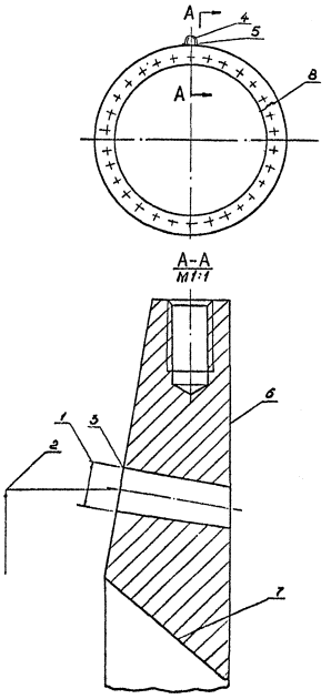 Рис. 2. Нижнее анкерное кольцо: 1 - износ отверстия под продольную арматуру; 2 - изменение диаметрального размера между центрами отверстий под продольную арматуру; 3 - износ поверхности сопряжения с удерживающей пластиной; 4 - деформация транспортного устройства; 5 - обрыв транспортной петли; 6 - деформация поверхности, сопрягаемой с наружной формой; 7 - износ поверхности сопряжения с раструбообразователем; 8 - трещина в теле кольца.