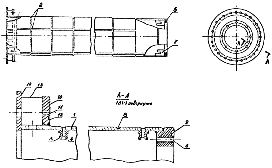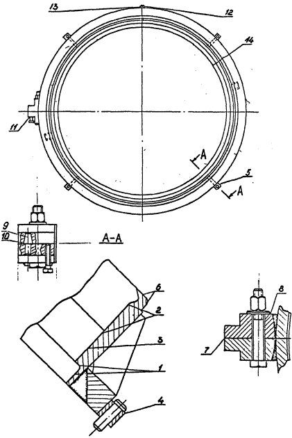 Рис. 3. Калибрующее кольцо: 1 - износ поверхности, сопрягаемой с наружной формой; 2 - износ калибрующей поверхности и поверхности буртика; 3 - деформация калибрующей поверхности и поверхности буртика; 14 - деформация кронштейна под упор, центрующий калибрующее кольцо относительно наружной формы; 5 - обрыв кронштейна под упор, центрирующий калибрующее кольцо относительно наружной формы; 6 - износ поверхностей, сопрягаемых с верхним анкерным кольцом; 7 - деформация замкового устройства; 8 - износ поверхности замка сопрягаемой с шайбой; 9 - износ центрирующего штифта; 10 - износ конической поверхности замкового устройства; 11 - деформация замкового устройства; 12 - деформация скобы; 13 - трещина скобы; 14 - трещина в теле кольца.