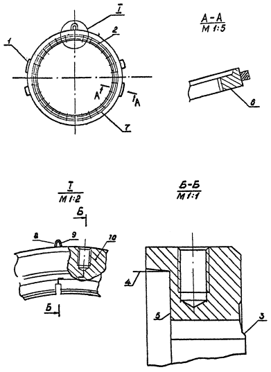 Рис. 4. Верхнее анкерное кольцо: 1 - износ пластика; 2 - износ паза под продольную арматуру; 3 - износ выточки под анкерную втулку; 4- износ диаметральной поверхности, сопряженной с калибрующим кольцом; 5 - износ торцевой поверхности сопряжения с калибрующим кольцом; 6 - деформация кольца; 7 - разрыв кольца; 8 - деформация петля; 9 - разрыв петли; 10 - трещина в теле кольца.