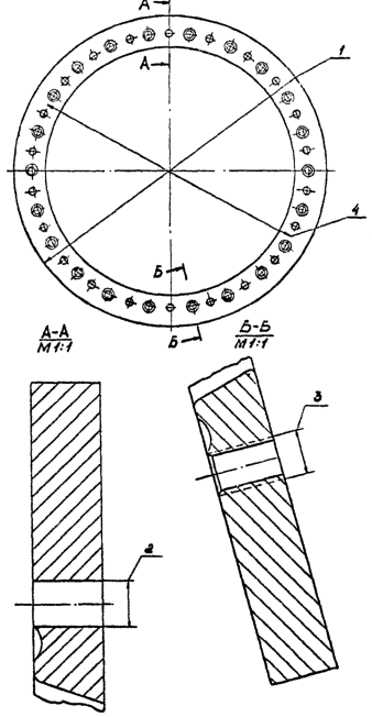 Рис. 7. Кольцо низшее: 1 - деформация кольца; 2 - износ отверстия; 3 - износ резьбы M16; 4 - изменение концентрового расстояния отверстий кольца.