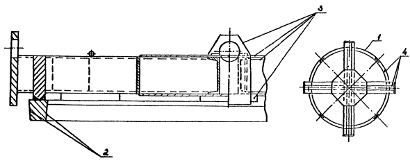 Рис. 8. Крестовина: 1 - деформация центрирующего кольца; 2 - износ уплотняющей поверхности центрирующего кольца; 3 - деформация кронштейнов, балок, швеллеров, подкладок, листов и накладок; 4 - трещины.