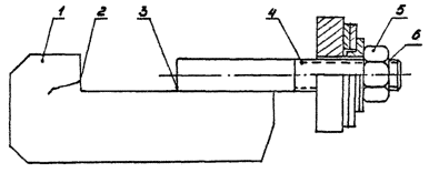 Рис. 9. Захват: 1- деформация скобы; 2 - трещина в теле скобы; 3 - трещина в сварном шве скобы; 4 - износ резьбы шпильки М36; 5 - износ граней гайки; 6 - износ резьбы гайки М36.