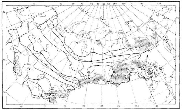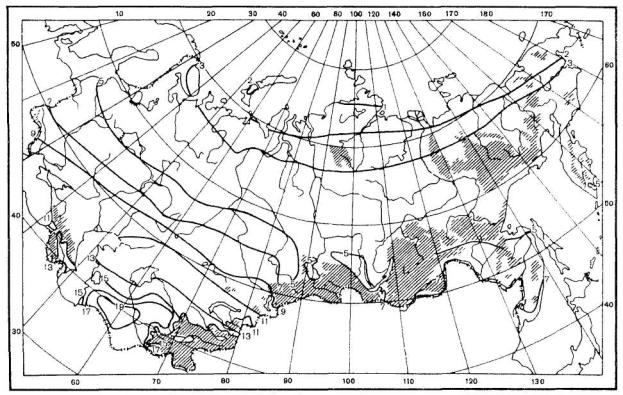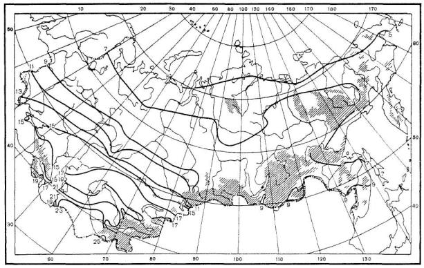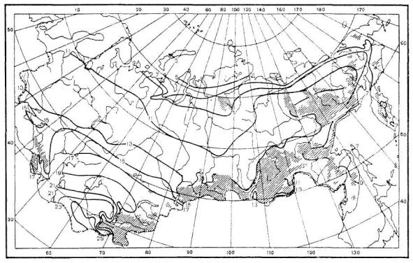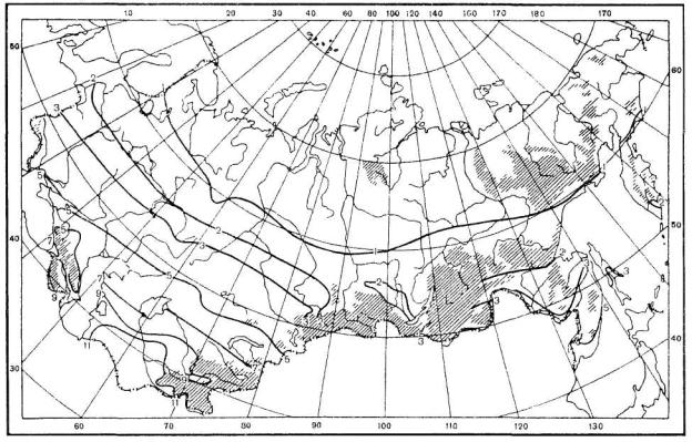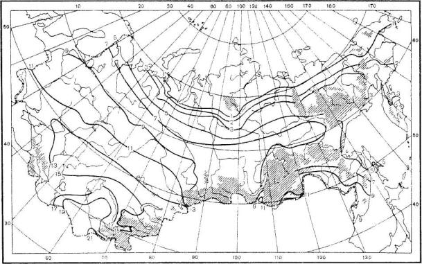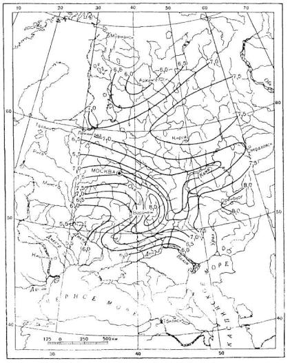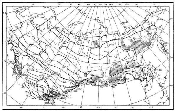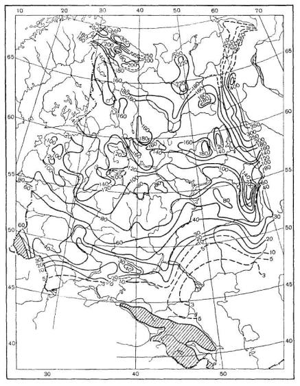 Рис. П2.20. Карта изолиний среднего слоя стока (мм) весеннего половодья (по А.А. Соколову):