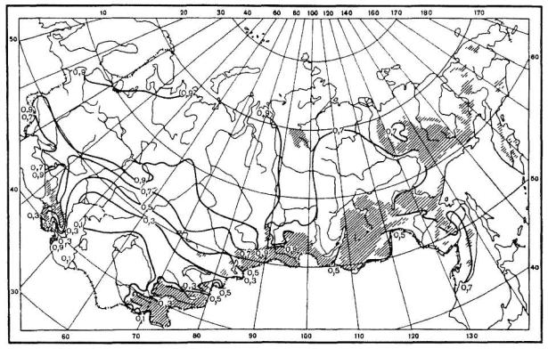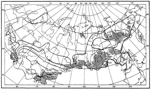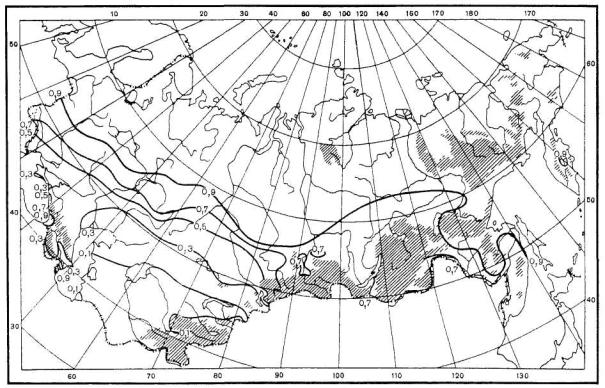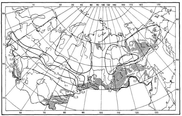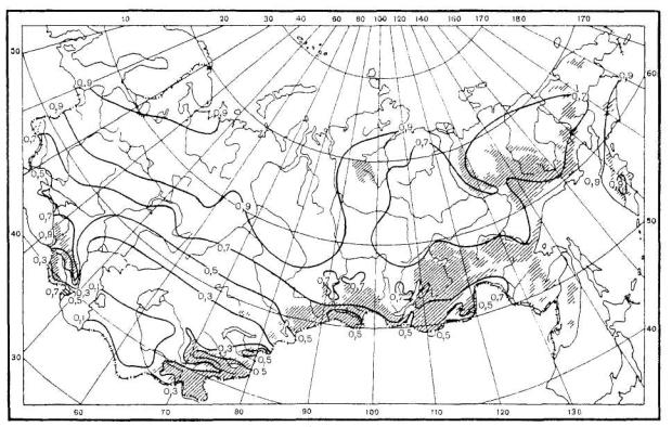 Рис. П2.3. Среднее годовое относительное испарение. E/E0