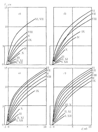 Рис. П2.4. Зависимость испаряемости E0 от дефицита влажности и воздуха d: а - зона тундры и лесотундры; б - зона хвойных лесов; в - зона смешанных лесов; г - зона лиственных лесов