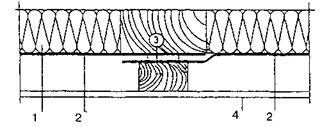 1 - теплоизоляция; 2 - пароизоляция; 3 - герметизирующая полоса; 4 - потолок (например, гипсокартон) Рисунок 2 - Стык (нахлестка) полотнищ пароизоляционных рулонных материалов 6.5 Для естественной вентиляции утепленной совмещенной кровли должны устраиваться входные и выходные отверстия. Входные отверстия (продухи) должны быть выполнены в виде сплошных щелей и располагаться на самой низкой точке крыши (в карнизе), а выходные - на самой высокой точке (в коньке). Размеры входного отверстия устанавливают