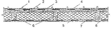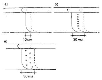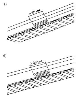 а - над холодным чердаком; б - над утепленным покрытием с одним вентиляционным каналом; в - то же, с двойным вентиляционным каналом; 1 - фальцевая медная кровля; 2 - подстилающий слой; 3 - сплошной настил из досок хвойных пород; 4 - стропила; 5 - дистанционный брусок; 6 - противоветровой слой из водоизоляционного паропроницаемого материала; 7 - теплоизоляция; 8 - пароизоляция; 9 - потолок Рисунок 1 - Варианты вентилируемых покрытий с кровлей из медных листов Для обеспечения надежной пароизоляции рекомендуется выполнять обжатый стык между полотнищами пароизоляционных рулонных материалов (рисунок 2).