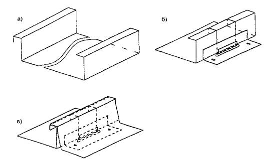 а - устройство кромок на листе; б - установка кляммера (скользящего кляммера) на основание и кромку листа; в - установка второго листа с отогнутой кромкой Рисунок 7 - Последовательность установки листов (лент) и кляммеров при устройстве фальцевого соединения