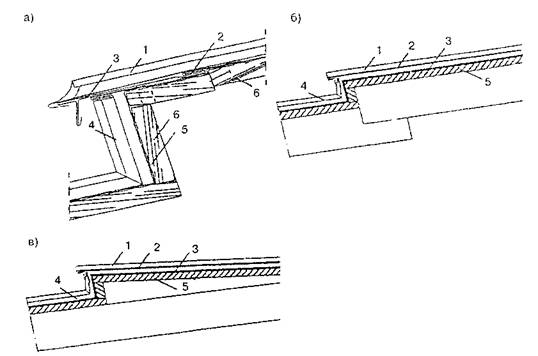 а: 1 - стоячий фальц со скошенными кромками; 2 - лежачий фальц со сплошным кляммером; 3 - карнизный свес; 4 - фальцевая медная кровля; 5 - подстилающий слой; 6 - основание под кровлю; б, в: 1 - стоячий фальц с квадратными кромками; 2 - карнизный свес; 3 - подстилающий слой; 4 - фальцевая медная кровля; 5 - основание под кровлю Рисунок 11 - Конструктивные ступени покрытия 8 Устройство узлов и соединений кровли8.1 Карниз8.1.1 В настиле основания у карниза выполняют