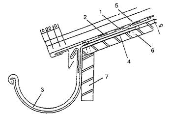 1 - карнизный свес; 2 - подстилающий слой; 3 - полукруглый водосточный желоб; 4 – кронштейн водосточного желоба; 5 - медная кровля; 6 - основание под кровлю; 7 - стена Рисунок 12 - Установка водосточного желоба 8.1.3 Элементы карнизного свеса выполняют с короткой нижней консолью (рисунок 13, а) или удлиненной нижней консолью с желобочным профилем (рисунок 13, б), заводимым за отгиб водосточного желоба (рисунок 12).