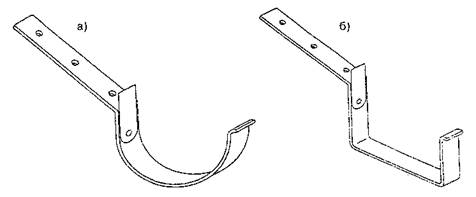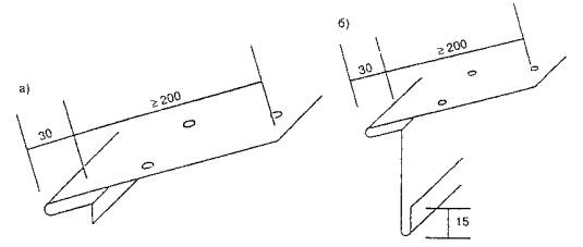 Рисунок 27 - Медный кронштейн для полукруглого желоба (а) и для желоба коробчатого сечения (б) 9.2.2 Желоб закрепляется к кронштейну медными хомутами с внутренней и наружной сторон или выступами, расположенными с наружной стороны и хомутом внутри, в зависимости от типа применяемого кронштейна. Принимаемые в зависимости от размеров желоба размеры сечения кронштейна указаны в таблице 3. Таблица 3